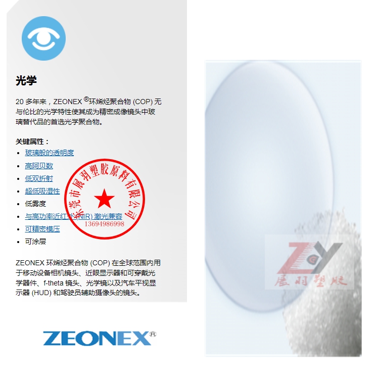 Zeon 的 ZEONEX? E48R 是一種不溶于水、無味、無色的環(huán)烯烴聚合物 (COP) 牌號。具有高透明度、優(yōu)異的光學(xué)性能、低雙折射和低吸水率。具有高透明度、高阿貝數(shù)、超低吸濕性、低霧度和良好的精密成型性。在熱和濕暴露后提供優(yōu)異的光學(xué)穩(wěn)定性??刹捎米⑺芗庸?。ZEONEX? E48R 建議用于汽車平視顯示器 (HUD)、駕駛員輔助攝像頭、移動設(shè)備攝像頭鏡頭、近眼顯示器、可穿戴光學(xué)器件和 f-theta 鏡頭的光學(xué)鏡和鏡頭。