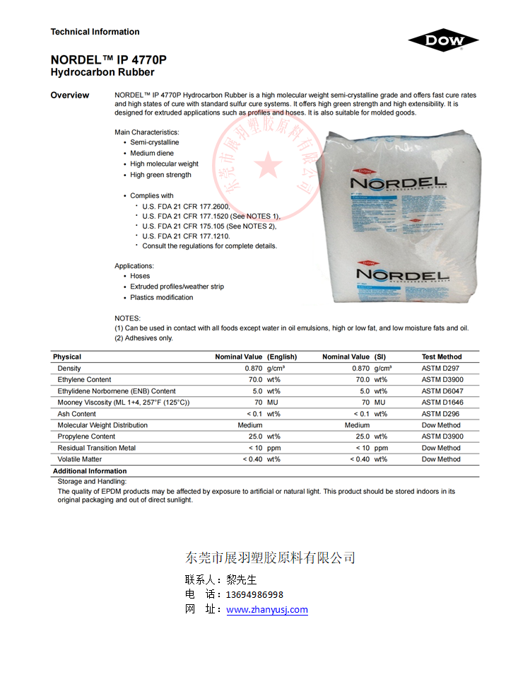 NORDELIP 4770P 美國陶氏 EPDM 高分子量 半結晶 三元乙丙橡膠
