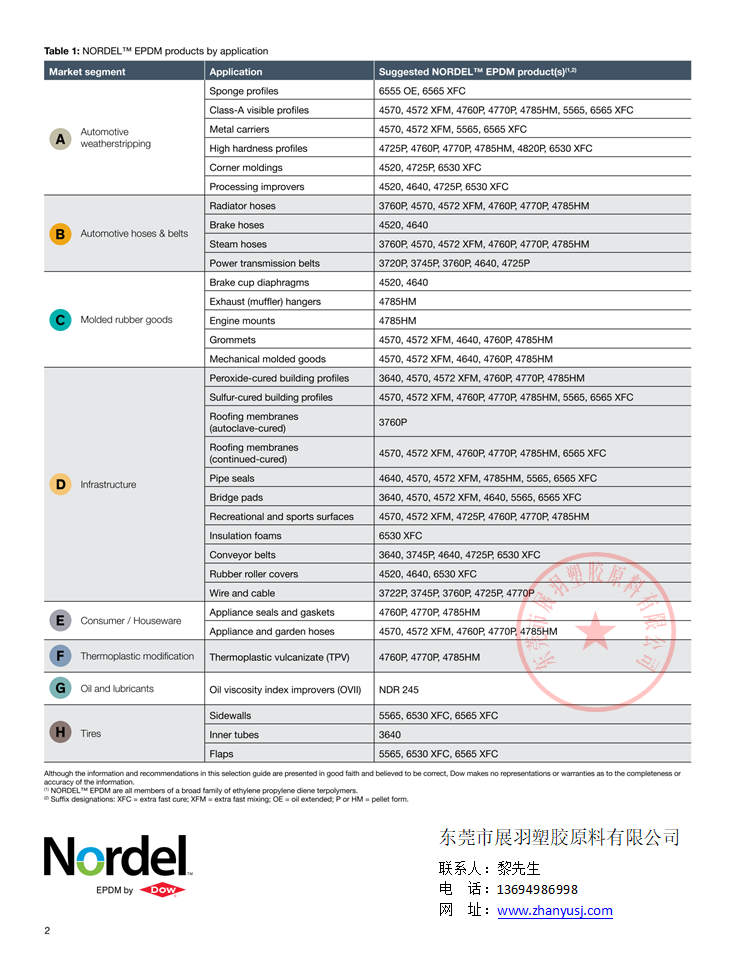 NORDEL™IP 3640碳氫橡膠是一種無定形的、低含二烯的乙烯-丙烯-二烯三元共聚物(EPDM),適用于耐熱過氧化物固化型材。NORDEL IP 3640可與丁基橡膠混合,以提高汽車和自行車輪胎內(nèi)管的加工和硫化性能。