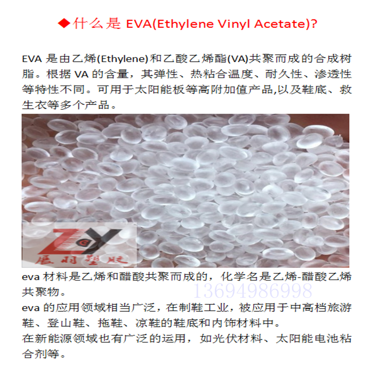 EVA是乙烯和醋酸共聚而成的,中文化學名稱:乙烯-醋酸乙烯共聚物(乙烯-乙酸乙烯共聚物),英文化學名稱:Ethylene Vinyl Acetate Copolymer 。EVA的應用領域相當廣泛,我國每年的市場消費量都在不斷地增加,尤其在制鞋工業,被應用于中高檔旅游鞋、登山鞋、拖鞋、涼鞋的鞋底和內飾材料中。在新能源領域也有廣泛的運用,如光伏材料、太陽能電池粘合劑等。