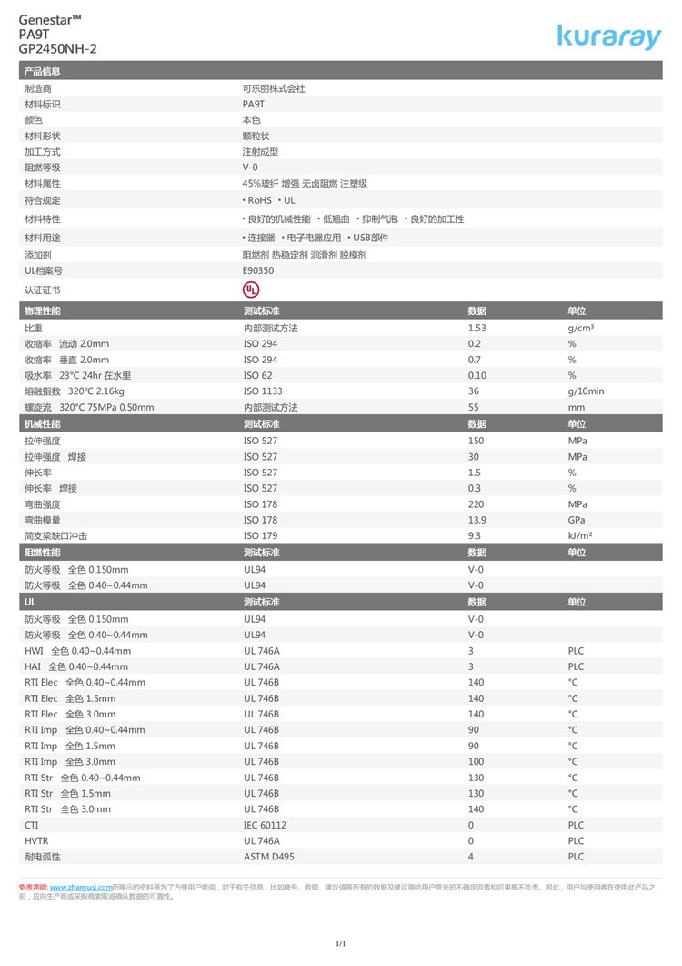 可樂麗 Genestar™ PA9T GP2450NH-2 >PA9T-GF45-FR< 阻燃等級: V-0 缺口沖擊: 9.3 kJ/m2 符合規定: RoHS ? UL