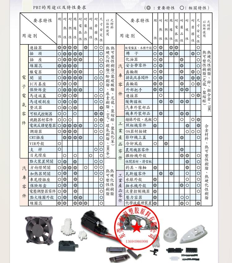 PBT(Polybutylene Terephthalate)中文名稱為聚丁烯對苯二甲酸酯。系由1,4-丁二醇與PTA聚縮合成之熱塑性聚酯樹脂;后段可經由玻纖強化,添加劑提升阻燃效果等改性方式,使其具有多項優良之電氣、機械特性,為應用最廣泛之高性能工程塑膠。