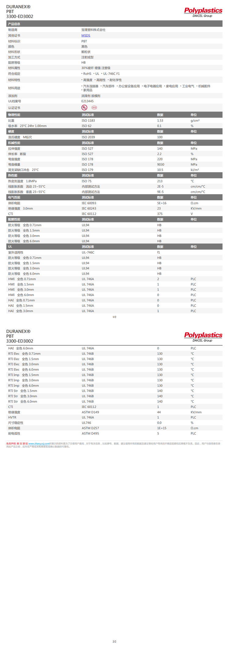 DURANEX® PBT 3300-ED3002 日本寶理 GF30 聚對苯二甲酸丁二醇酯