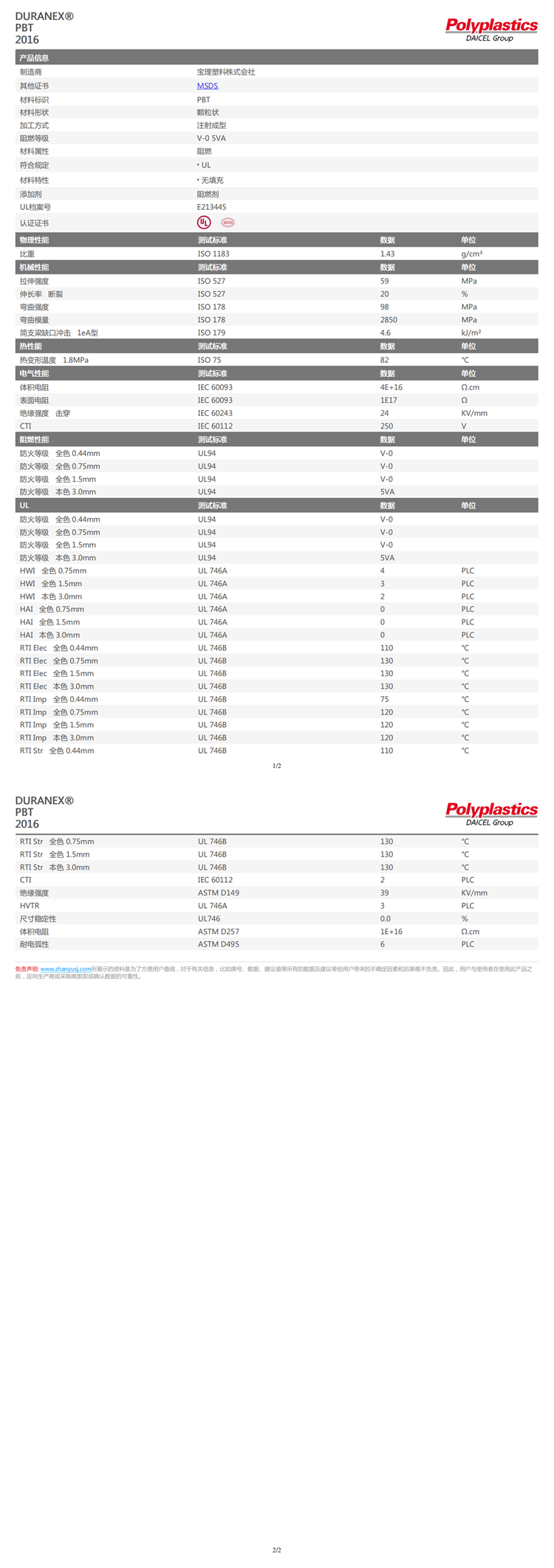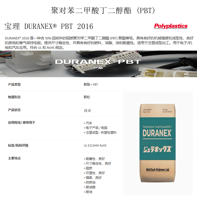 寶理 DURANEX® PBT 2016 無(wú)填充 阻燃 V-0 聚對(duì)苯二甲酸丁二醇酯