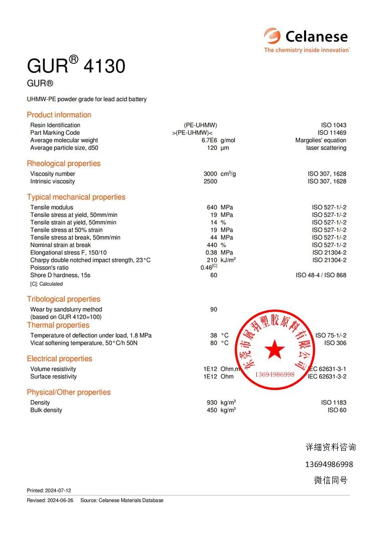 塞拉尼斯 GUR 4130 超高分子量聚乙烯 UHMW-PE粉末級(jí) 鉛酸電池專用