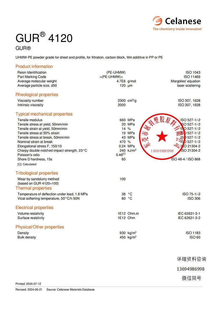 Celanese 的 GUR? 4120 是一種自潤滑線性超高分子量聚乙烯 (UHMWPE),使用 Margolies 方程計算,分子量約為 4.5 MM g/mol。加工后具有出色的耐磨性、高沖擊強度、低摩擦系數和不粘表面。