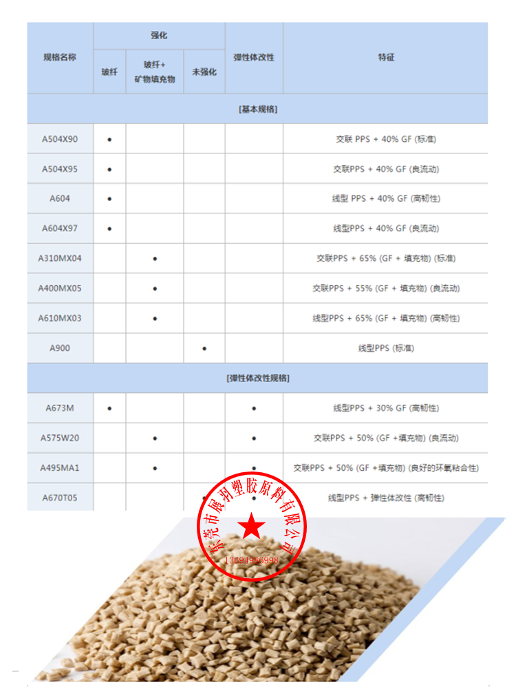 基本規格包括玻纖強化類型(高強度和相對較高的韌性),玻纖+填充物強化類型 (較高的尺寸精度),非強化類型(強度較低但粘度較高)。每種規格都可以有交聯型(抗蠕變性能很好)和線型(韌性高)。除此以外,還有其他類型樹脂,例如高流動類型(調整強化材和聚合物分子量)、彈性體改性類型(改良PPS的低韌性)。另外也提供特殊規格的樹脂,如高滑動規格、高激光熔接規格、低氯規格、耐漏電起痕規格以及其他。