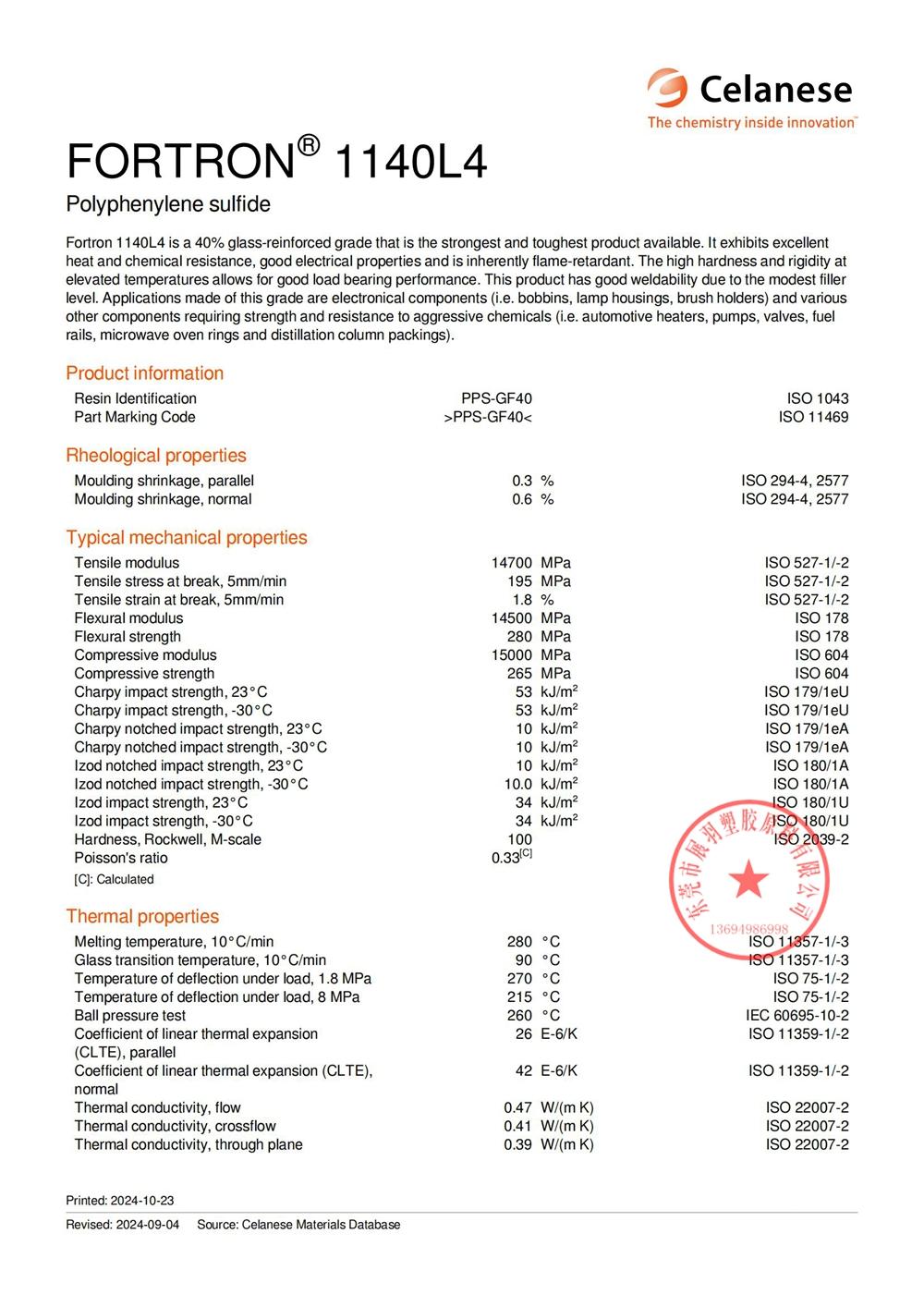 FORTRON 1140L4 (PPS-GF40)40%玻纖增強 阻燃 熱穩定 耐化學 聚苯硫醚