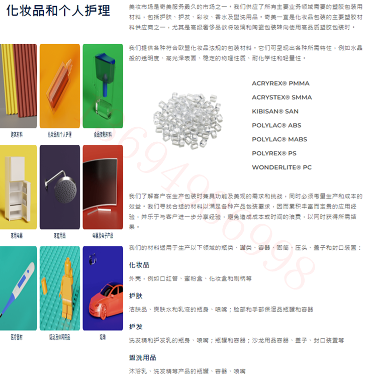 奇美的POLYLAC?PS樹脂是以熱聚合的苯乙烯為主原料的共聚物。由SM和丁二烯(BD)構成的高抗沖聚苯乙烯(HIPS)。HIPS是一種抗沖擊性極高的不透明材料。得益于其出色的可加工性,POLYREX? 可被廣泛應用于家用電器、食品和飲用水容器、玩具和建筑材料(尤其是電器外殼)中。這種材料符合RoHS、REACH SVHC、UL和針對各種應用的多項國際標準。