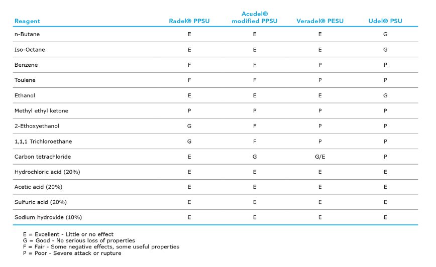 砜類聚合物表現(xiàn)出不同程度的耐化學(xué)性,這取決于其聚合物結(jié)構(gòu)和玻璃等添加劑的存在。影響耐化學(xué)性的其他因素包括試劑、試劑濃度、溫度、暴露時(shí)間以及聚合物是否受到壓力。