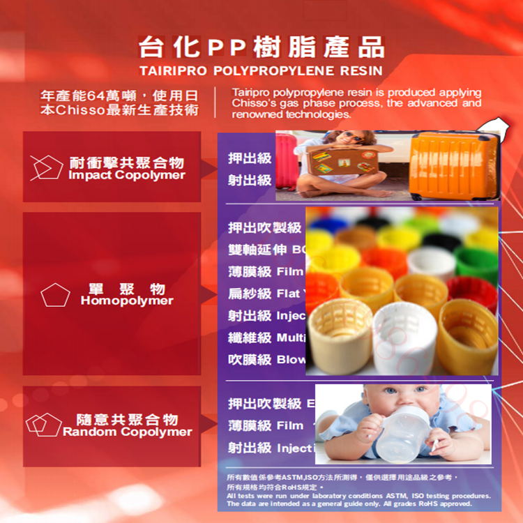 臺化PP樹脂(TIRIPRO? PP Resin)采用日本CHISSO氣相制程法,以新一代高活性觸媒,及嚴密之質量管理系統,年產達51萬公噸。可生產單聚物( HOMOPOLYMER),共聚物( RANDOM及IMPACT COPOLYMER),供應射出、押出、纖維、吹氣、真空成型等加工業者,廣泛運用于家電、汽車零配件、食品包裝、玩具及民生用品。本廠設有研發中心及整套實驗工場,有能力進行新規格開發及加工技術服務。本廠生產設備采嚴格環保標準,且生產技術成熟穩定,無污染環境之疑慮。廢氣經高溫燃燒,熱量予以回收。聚合制程則無廢水產生。