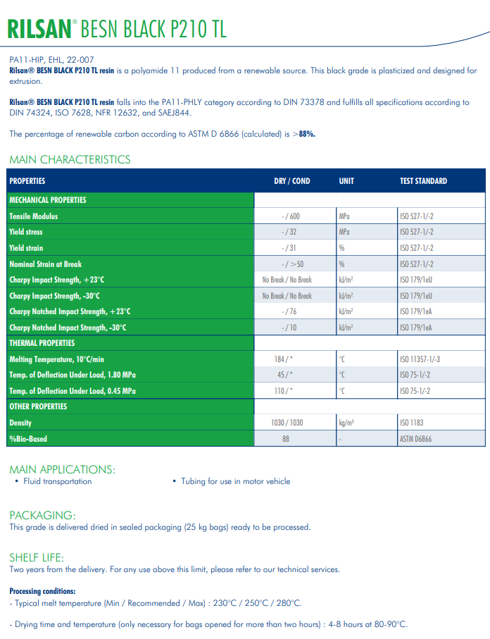 Rilsan ®聚酰胺11 易于加工,可使用大多數加工技術(擠出、擠出吹塑、注塑和滾塑)。聚酰胺 11 基體可容納無數添加劑和填充劑,例如增塑劑、穩定劑、著色劑、潤滑劑、抗沖改性劑、玻璃纖維、碳纖維等。聚酰胺 11 的工作溫度范圍很廣(-40° C 至 +130° C) .