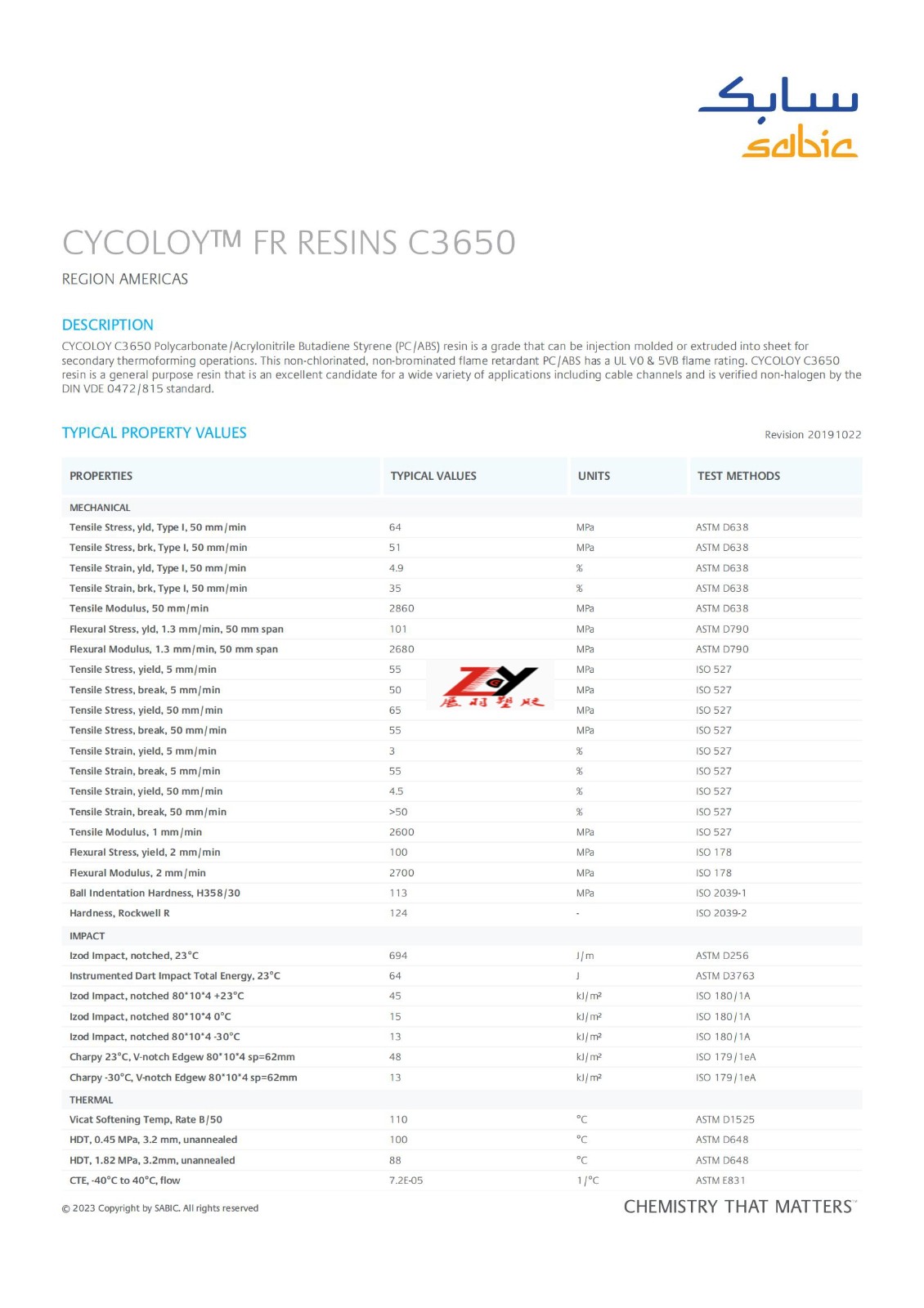 CYCOLOY C3650 物性參數表 PC/ABS物性數據,CYCOLOY? FR RESINS C3650,PC+ABS物性表,聚碳酸酯+丙烯腈丁二烯苯乙烯