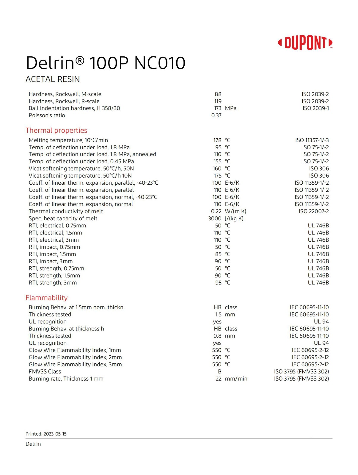 Delrin 100P NC010英文物性表, POM100P物性表,美國杜邦100P物性數據,聚甲醛100P原廠物性表。